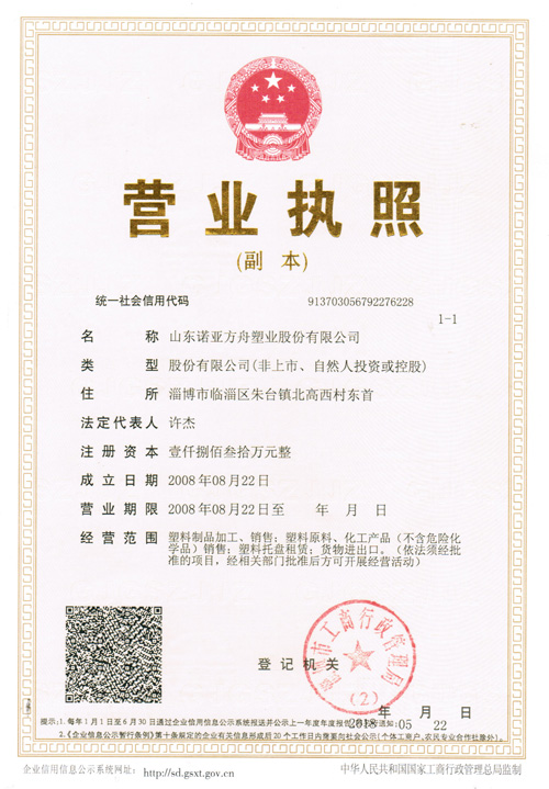 山東諾亞方舟塑業(yè)股份有限公司營(yíng)業(yè)執(zhí)照